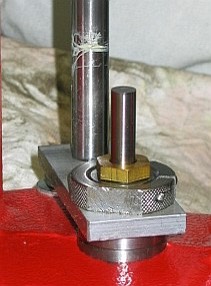 This pic (left) shows all of the parts: from left, a Hornady 7/8thsX14 lock-ring, which locks the ejector frame onto the ram-adapter; the brass punch-holder nut; a Niemi core-seat punch; behind that, the ram-adapter, threaded to fit the ram-bore thread (bottom) and the Hornady lock-ring (top). The adapter is bored and threaded to hold punches and the punch-nut – all pretty simple. Below, the assembled parts should clear-up any confusion. The ejector-frame (base) plate is bored to fit over the 7/8thsX14 threaded tenon, and held tight with the Hornady lock-ring, for stress-free punch holding/floating (note: O-rings limit the “float”); the ejector-frame rod is threaded into a hole in the base-plate, and guided by the oil-lite bushing held in the “flange” mounted at the top – simple, rigid, and effective! [smile][cool]