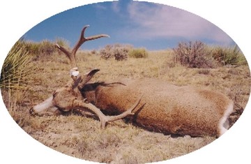 This is a shot of RG's 2003 mule deer where [and as] he fell after being pierced by a 132 Gr. BIB from a distance of 268 Yd; the deer was not moved. However, note that the harvest/carcass tag was signed, cut and attached! About 1/2 hour prior to finding and shooting this OLD boy, I had the pleasure of being struck by an inaccurate RATTLE SNAKE – the 18-20 incher hit the top portion of my 10" tall huntin' boot (he was likely too short as opposed to being "inaccurate!)! That made 'slipping about in the sage a little more interesting . . .