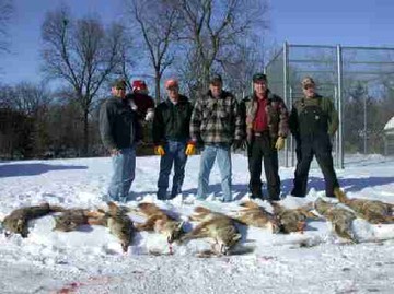 Now it was Mikes turn, down went the next one with Mikes new light 22-250 rig. Then Cory popped one, then Hoppie and his pal got one, one more for me and one more for Mike B. Next Mike D.(who really worked hard for his first one) walked 1/2 mile out in to a section then a 1/4 mile to the east, got his the first go at this coyote at about 10 ft. It took Mike D. a few shots, but he did one last long poke at him a good 300 + yds. and dumped him (the coyote).