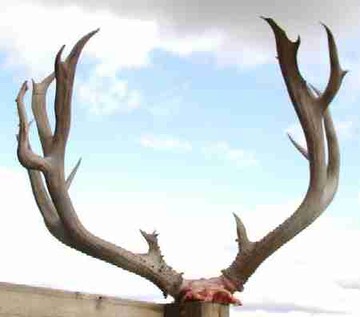 Well, here he is. We gross scored him at 194 and after deductions he was 190. He is 25 wide and 20 high, has 7 scorable points on each side. We found him in the SW corner (south of the Hoff reservior along the south fence) of the O'Brian place on thurs. We were really lucky and saw them while we were driving along the trail at 11:30. He was with 4 other bucks and they were moving up the bottom of the draw when Kent saw them. We figured they were going to bed down in the head of a side draw so we waited about 30 minutes then headed after them. I sent Kent around to top where we thought they would be and slowly went up the bottom. Kent said he saw them at 250 yds and could just see the horns on the big buck. One off the smaller bucks saw him so he waited until the big buck stood up. There was about a 20 mph crosswind so he held behind the ribs a hit him in the point of his front shoulder and that was that. Needless to say we were very happy when we walked up to him.