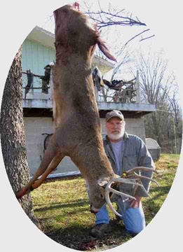 Fully ten minutes passed before a second doe materialized – this one closely pursued by a "nice" 8-point! Before I could react, Big MIKE was ready to loose an arrow! Fortunately, at the same point as the first doe, doe number two opted to swerve east! With the buck in tow, she went about ten yards deeper into the cover, and then turned back south, proceeding along a trail which would place them at only 20 yards out, but with too much under story to offer a reasonable shot! When the buck paused, his vitals centered in a saucer sized "hole", I wrested control over Big Mike and convinced HIM that we'd get a better opportunity. At that point, the doe decided she needed to be somewhere else – and PRONTO – she took off to the south at a brisk trot! As she approached the edge of the deep ravine, about 50 Yd S.E. of our stand location, she slammed on the brakes and did a partial "about face" and came sprinting directly AT us! Meanwhile, 'our 8-point buck' had resumed the chase!